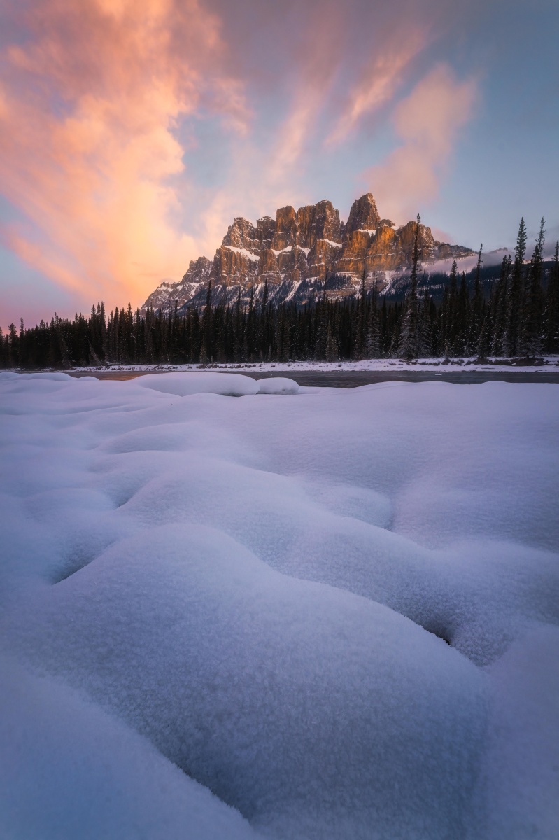 雪落班芙城堡山,如给赭红岩壁裹上白绒披风。峰峦棱角被积雪柔化,沟壑间堆起蓬松雪痕,似古堡斑驳的银饰。晨雾漫过雪坡,与岩色相映,晕出淡紫灰的朦胧感。阳光斜照时,雪面泛着碎金光泽,裸露的岩崖如城堡坚壁,雪线勾勒出凌厉又温婉的轮廓。林间松枝缀满雪团,风过簌簌落雪,与远处冰原的清冽气息交织。山脚下,积雪覆着步道,偶有鸟兽足迹蜿蜒,为这片静谧添了丝灵动。整座山似沉眠的雪域古堡,冷冽中藏着雄浑,清寂里透着庄严,尽是班芙独有的冬日磅礴与柔美。#我的旅行影像日记
